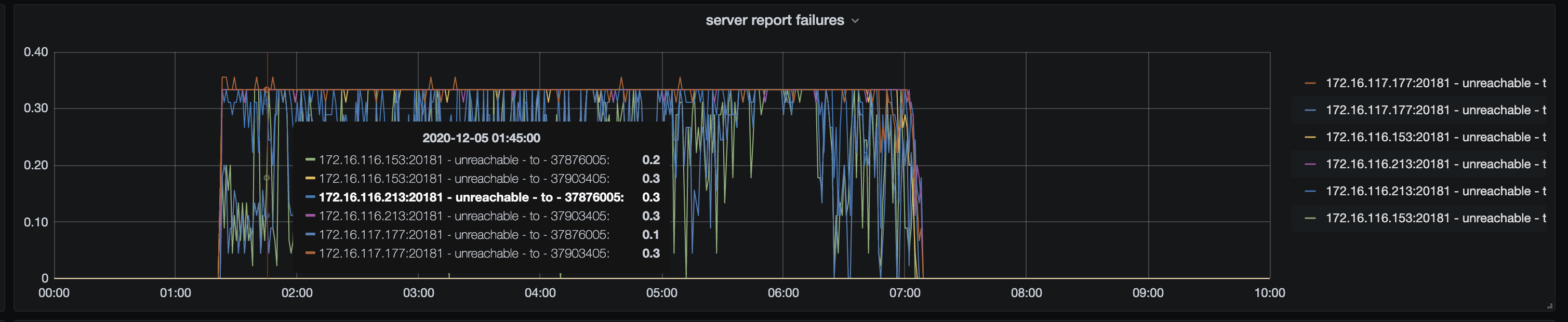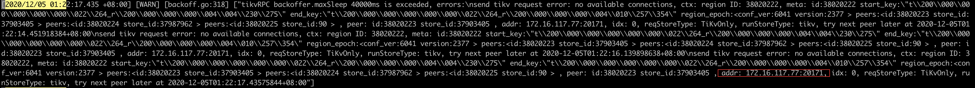 tidb.log 中 对于 172.16.117.77:20171 这个挂掉的 tikv 节点,持续报 no available connections 的日志,持续到 2020-12-05 12:57 ,这个现象应该是不符合预期的,需要再分析一下原因。