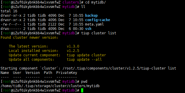 这个 mytidb 是在 tidb 用户的家目录里?那么 tiup cluster list 要用 tidb 用户执行才能看得到