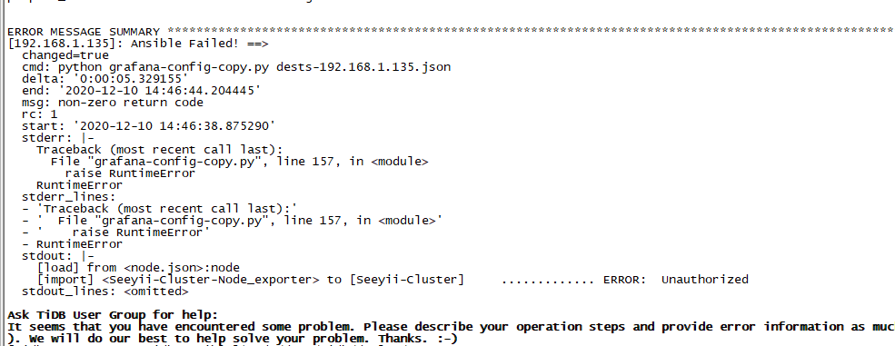 - 【问题描述】:1 tidb 1pd 5tikv 2 pump 2drainer ,现在有一个tikv节点机器有问题,启动的时候我在把那个tikv节点在 inventory.ini 里面注释掉了。 启动之后数据库可以正常使用,但是grafana监控页面有问题,grafana.log一直报错