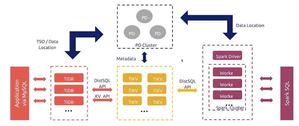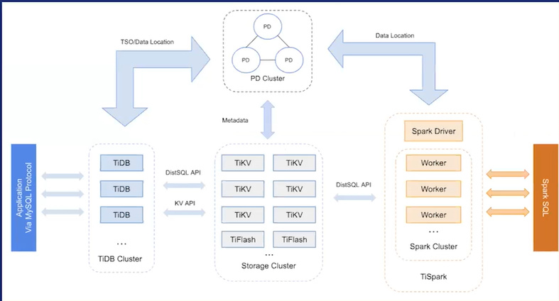 1.4节简要介绍了 TiDB 核心系统的各个组件以及部分 TiDB 的生态工具。TiDB的核心是计算分离的架构,由TiDB cluster、Storage Cluster以及TiSpark负责运算,如图所示