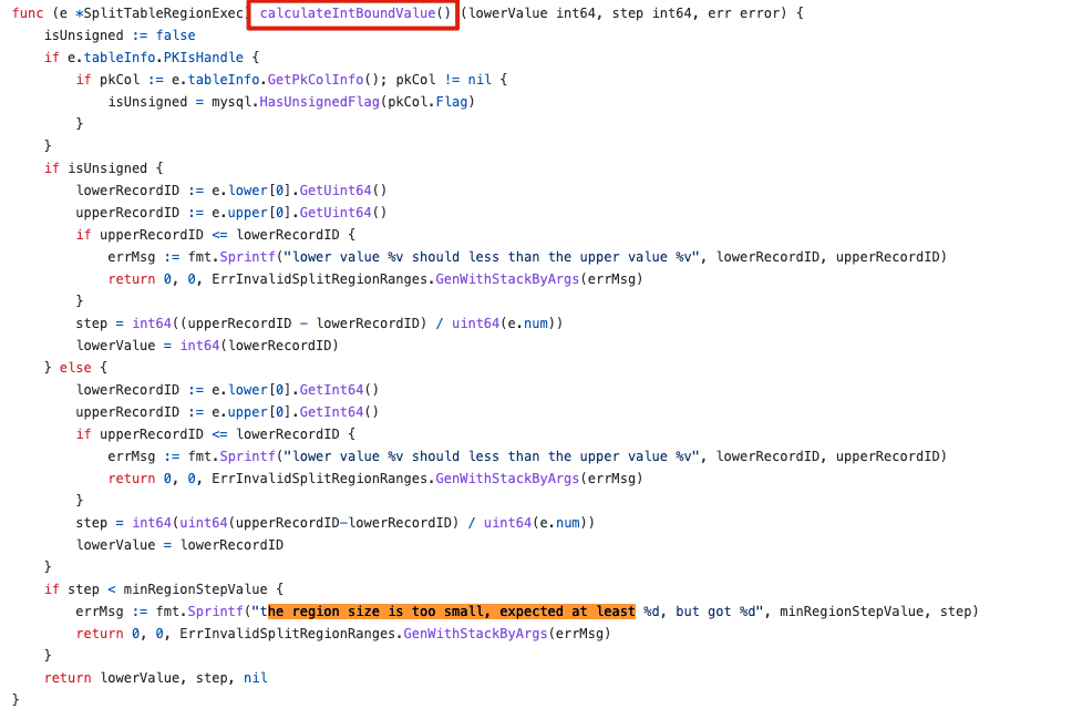 return 0, 0, errors.Errorf(“Split table %s region step value should more than %v, step %v is invalid”, e.tableInfo.Name, minRegionStepValue, step)