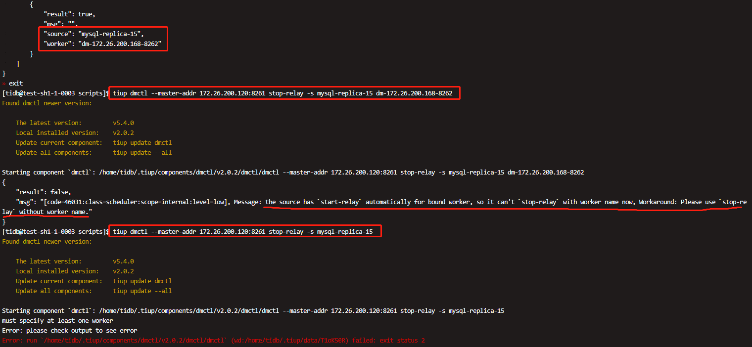 Message: the source has start-relay automatically for bound worker, so it can’t stop-relay with worker name now, Workaround: Please use stop-relay without worker name."
