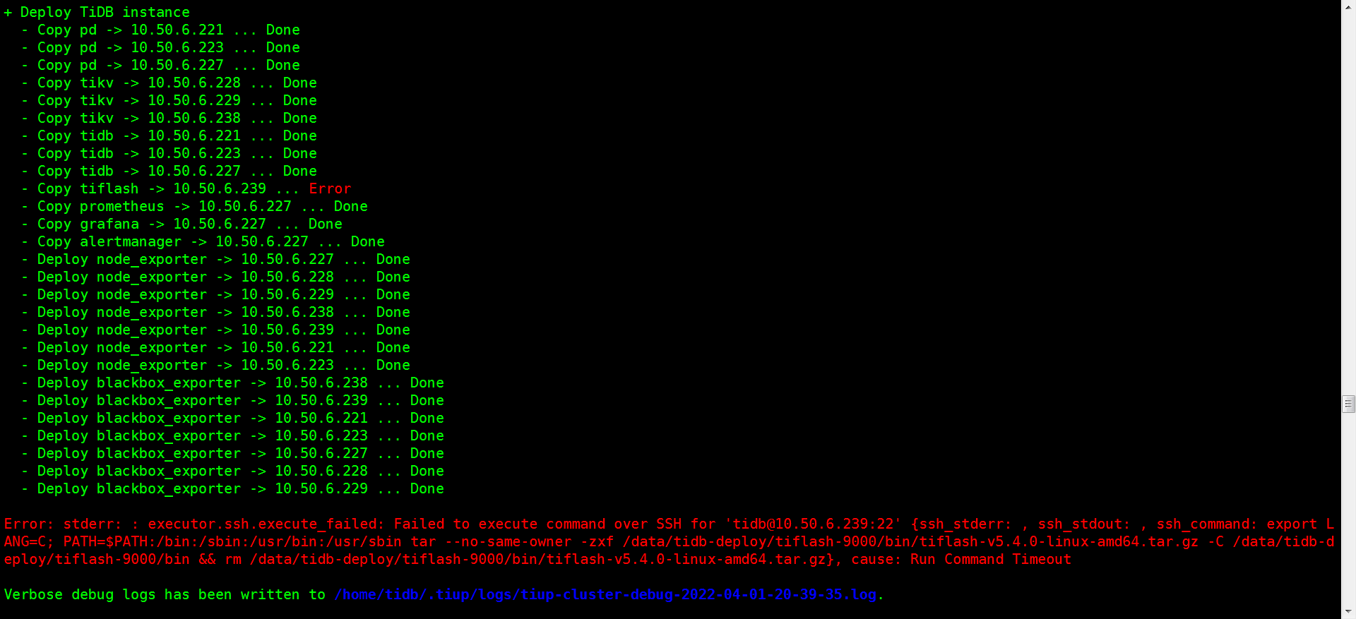 ANG=C; PATH=$PATH:/bin:/sbin:/usr/bin:/usr/sbin tar --no-same-owner -zxf /data/tidb-deploy/tiflash-9000/bin/tiflash-v5.4.0-linux-amd64.tar.gz -C /data/tidb-deploy/tiflash-9000/bin && rm /data/tidb-deploy/tiflash-9000/bin/tiflash-v5.4.0-linux-amd64.tar.gz}, cause: Run Command Timeout