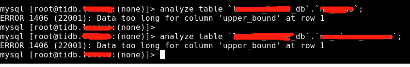 另外,在tidb_slow_query.log日志中有对表的analyze,经过检查,发现只对两张表进行analyze,我手工执行报错如下:
