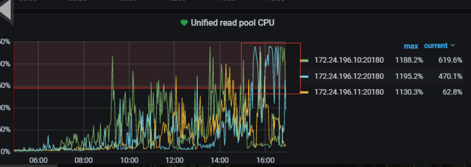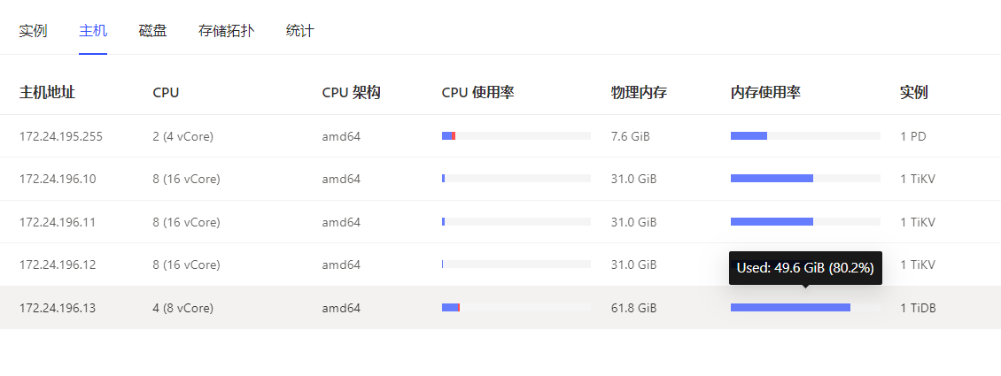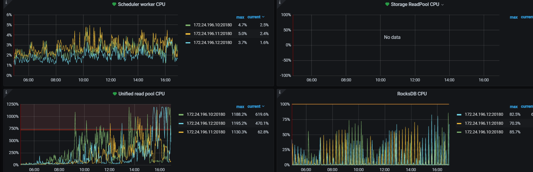 └─Selection_66 cop[tikv] 0 or(gt(doujia.sxt_qc_order_hour_interval_report.stat_cost, 0), gt(doujia.sxt_qc_order_hour_interval_report.pay_order_amount, 0)) 569412 time:1m7.1s, loops:703, cop_task: {num: 84, max: 2.81s, min: 518µs, avg: 878.6ms, p95: 2.53s, max_proc_keys: 20480, p95_proc_keys: 20480, tot_proc: 1m9.9s, tot_wait: 2.41s, rpc_num: 84, rpc_time: 1m13.8s, copr_cache_hit_ratio: 0.11}, tikv_task:{proc max:469ms, min:0s, p80:381ms, p95:430ms, iters:949, tasks:84}, scan_detail: {total_process_keys: 680101, total_process_keys_size: 205086093, total_keys: 709744, rocksdb: {delete_skipped_count: 5242, key_skipped_count: 108929, block: {cache_hit_count: 3590179, read_count: 0, read_byte: 0 Bytes}}} N/A N/A