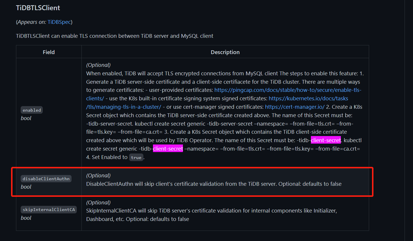 也可以设置 mountClusterClientSecret: false,然后通过 设置 spec.pd.config、spec.pd.additionalVolumes、spec.pd.additionalVolumeMounts 来自定义 证书挂载。