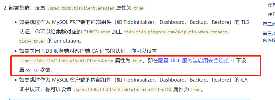 目前我用1.2.6版本的operator,开启mysql客户端和tidb实例之间的ssl之后,PD的configmap还是有这个配置,需要在secret里面加上ca证书的信息实例才能被重启。如果我开启问题中的那个免去CA认证的配置之后,还必须在secret里面加上ca证书的信息吗?