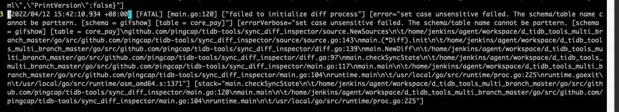 [2022/04/13 11:15:47.600 +08:00] [FATAL] [main.go:120] [“failed to initialize diff process”] [error="from upstream: please make sure the filter is correct.: the source has no table to be compared. target-table is gifshow`.`core_pay"] [errorVerbose=“the source has no table to be compared. target-table is gifshow`.`core_pay\ngithub.com/pingcap/tidb-tools/sync_diff_inspector/source.checkTableMatched\