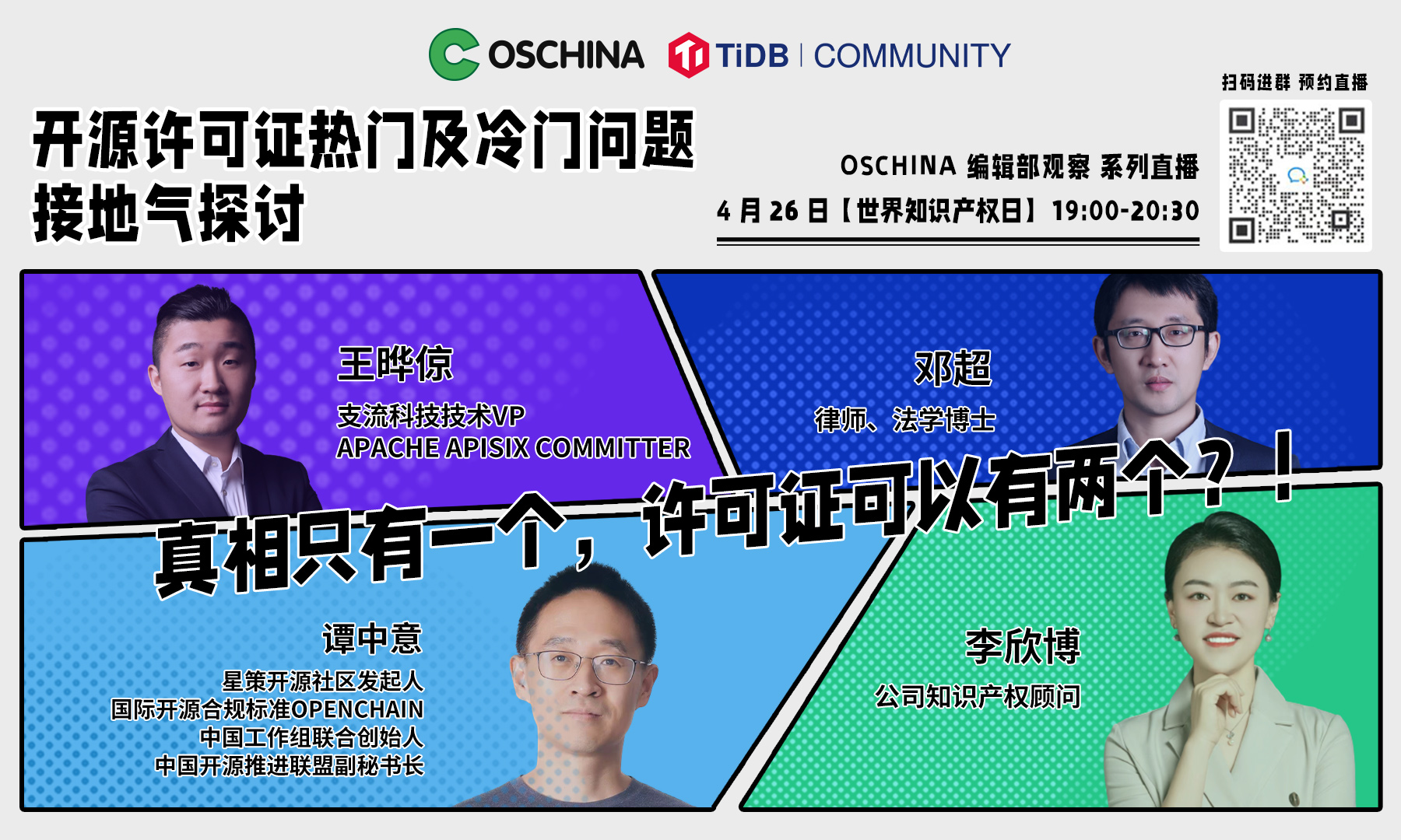 随着开源事业的快速发展,开源的法律问题受到前所未有的关注,尤其“许可证使用及纠纷”类话题常常引起热议。开源中国编辑部长期观察开发者在许可证方面提出的问题,总结了 3 个方向的话题,借本年度【世界知识产权日】的契机,特此邀请业内大咖答疑解惑。