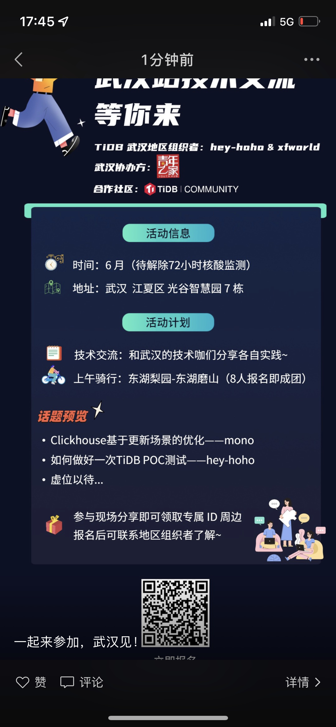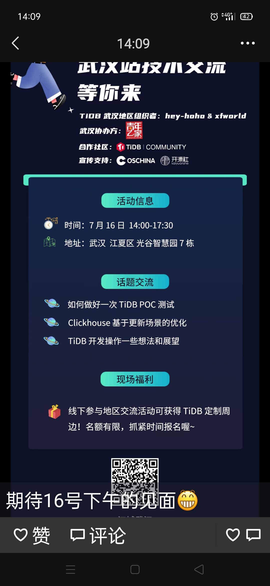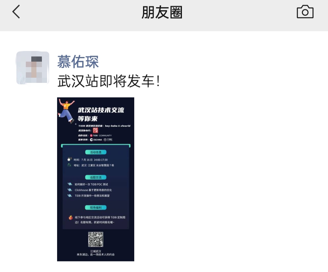 如果你在武汉,而且你还有更多技术实践想跟大家分享(内容话题不限于数据库),可以在评论区留言