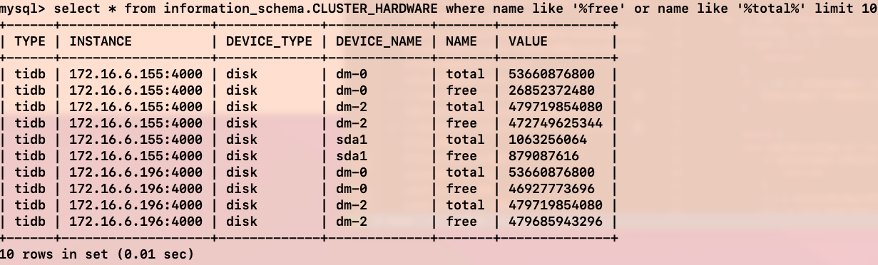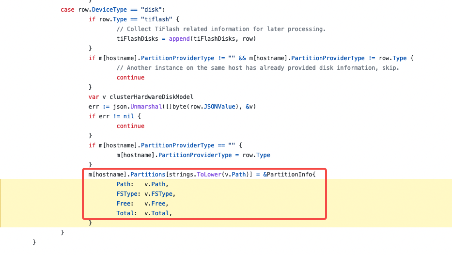 Answer: Dashboard 中可视化的信息来自 TiDB 的 CLUSTER_HARDWARE 表;从 func FillFromClusterHardwareTable 得到 disk 信息 并在 func expandDisksItems 与 IP 信息关联,及按组件分类