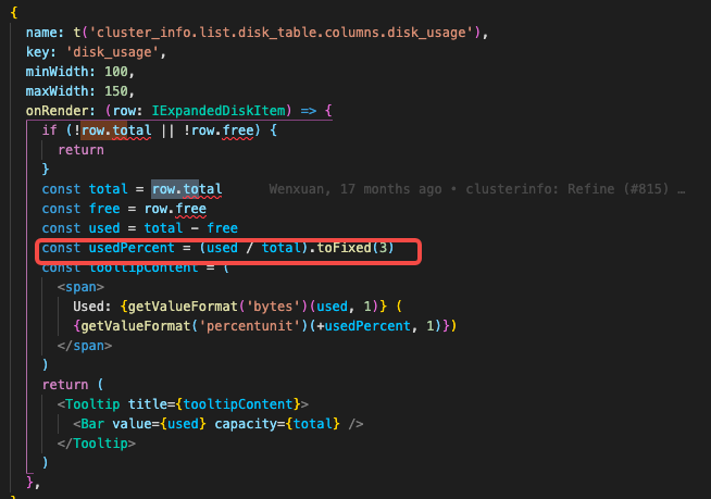Answer: used / total 并取 小数点 后三位 ,from → tidb-dashboard/ui/lib/apps/ClusterInfo/components/DiskTable.tsx at d0be2dad83c6a1a7fca3b66fccdb7f0413b7559e · pingcap/tidb-dashboard · GitHub
