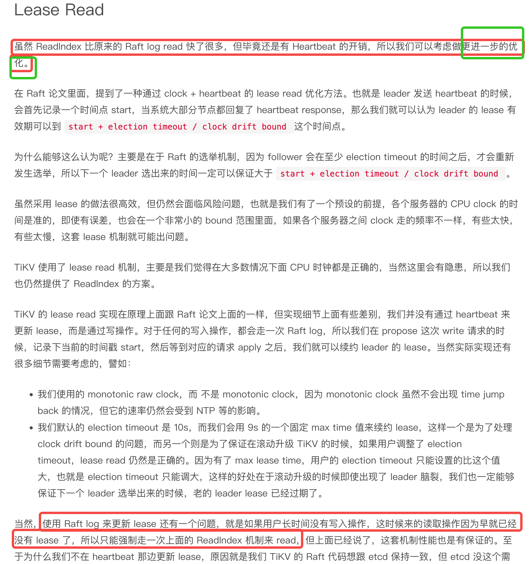 - Lease Read 是 raft leader 用来确认其仍然是 leader 的租约,在 lease 租约内,不允许其他 voter 选主成功,leader 通过租约时间确认其 leader 地位(不用通过发送心跳确认)。