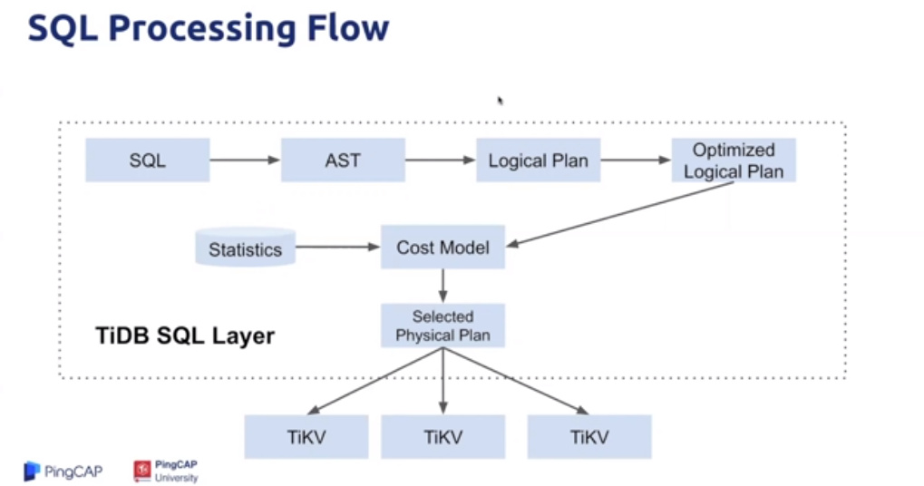 tidb : sql解析,无状态,负载均衡需要外部软件或硬件 tikv:存储数据,给予 local kv storage ,raft复制 mvcc pd: 分布式事务id ,元信息,调度 tiflush tispack