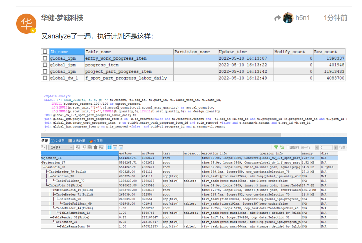 执行过analyze table 收集2个表的统计信息吗? 看你的执行计划最初的estRows和actRows差别很大,后面的一致了,如果收集过试试不加hint是否有问题?