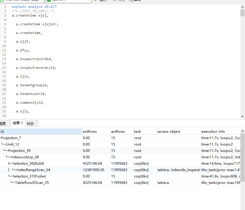 【 TiDB 使用环境】生产环境 【 TiDB 版本】5.3 【遇到的问题】查询时候 tinyint类型 过滤条件为2的时候,查询效率严重慢 【复现路径】select* from xxx where a=1 limit 10,很快,a=2很慢