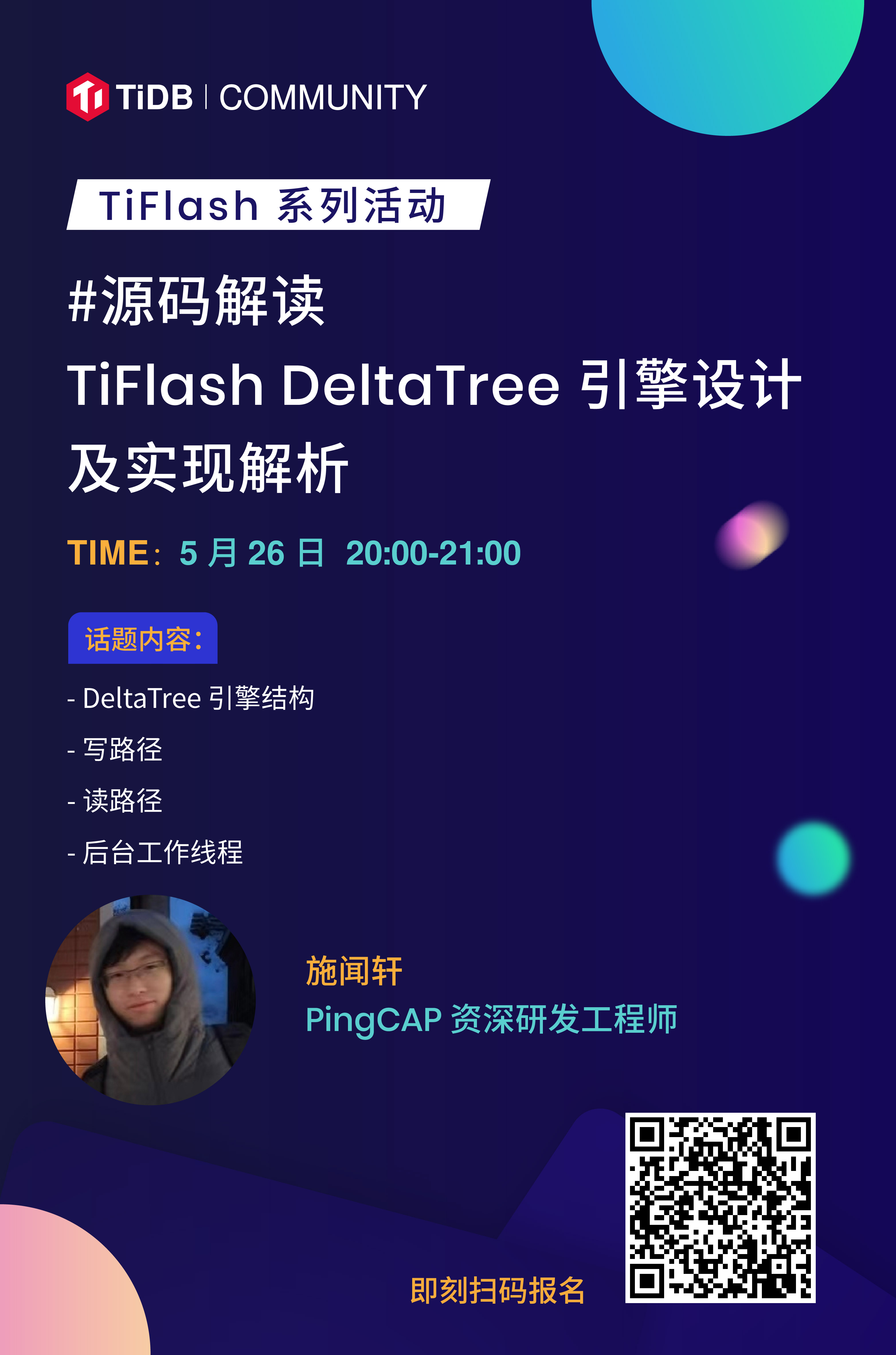 欢迎回到 TiFlash 源码解读系列!本期将由 PingCAP 资深研发工程师 施闻轩 来和大家介绍 TiFlash DeltaTree 引擎设计及实现解析 ,通过本期分享,你将 深入理解 TiFlash 存储层 DeltaTree 引擎的读写工作流程及代码实现,从而能对 DeltaTree 引擎源码做出进一步修改。
