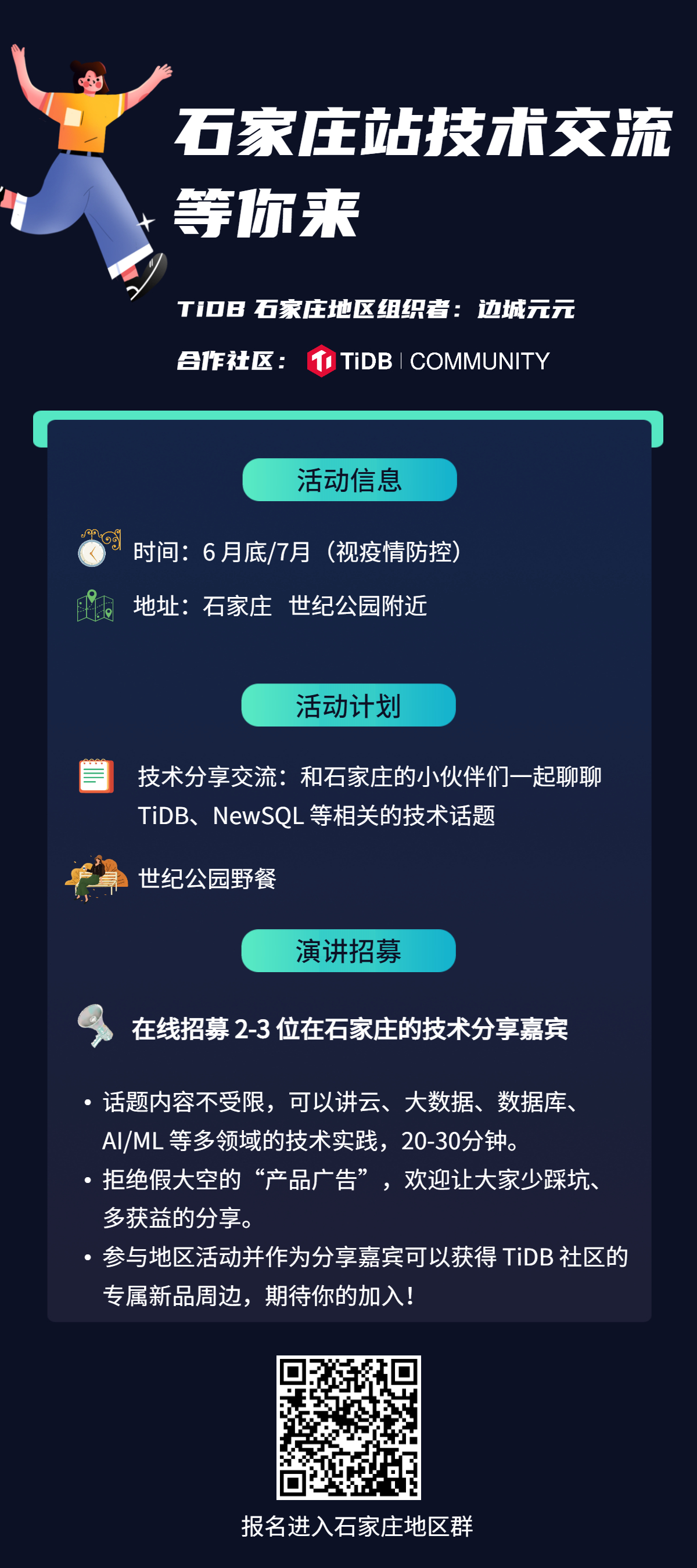 “终于有石家庄了!”,感谢石家庄组织者边城元元能在石家庄发起一场技术交流活动,目前活动正在招募感兴趣的分享嘉宾,如果你在石家庄,如果你在大数据、数据库、云等领域有些经验总结,欢迎你随时加入!