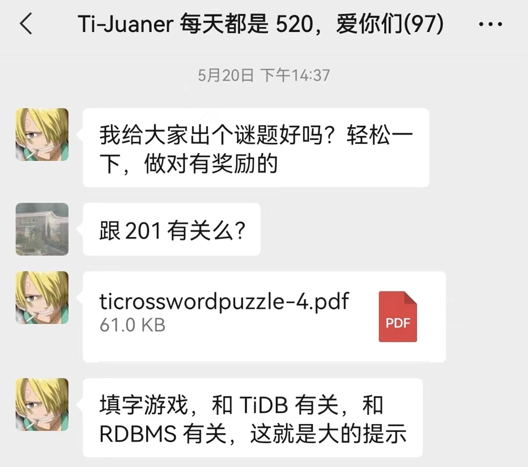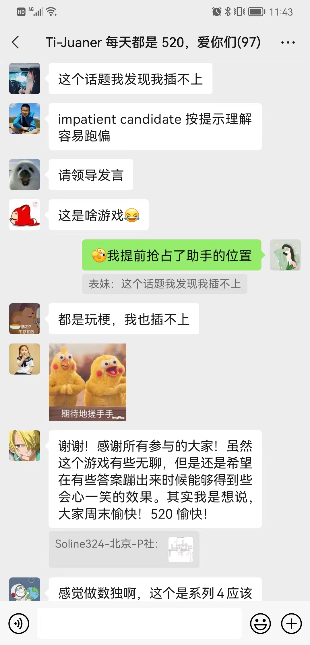 事情要从 520 当天下午 @包老师呀 在 Ti-Juaner 群里突然发布的一个填字游戏说起。