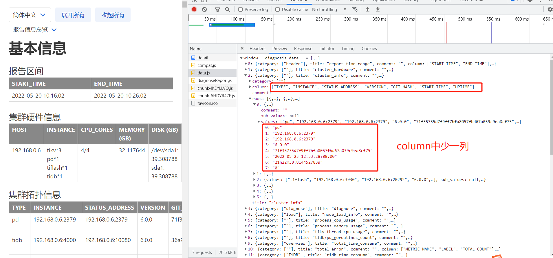TiDB V6.0版本中,Dashboard集群诊断后,查看完整诊断报告中, 集群拓扑信息表格中缺少一列标题