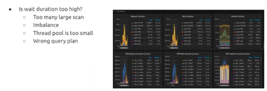 如果等待时间高,需要评估SQL语句是否存在大范围的scan、负载是否均衡、统一线程是否太小、执行计划是否正确
