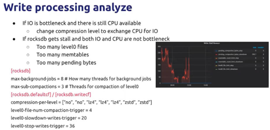 如果io和cpu都不是瓶颈,性能很差,通常是因为 太多的level0文件、太多的memtables、太多的pending数据