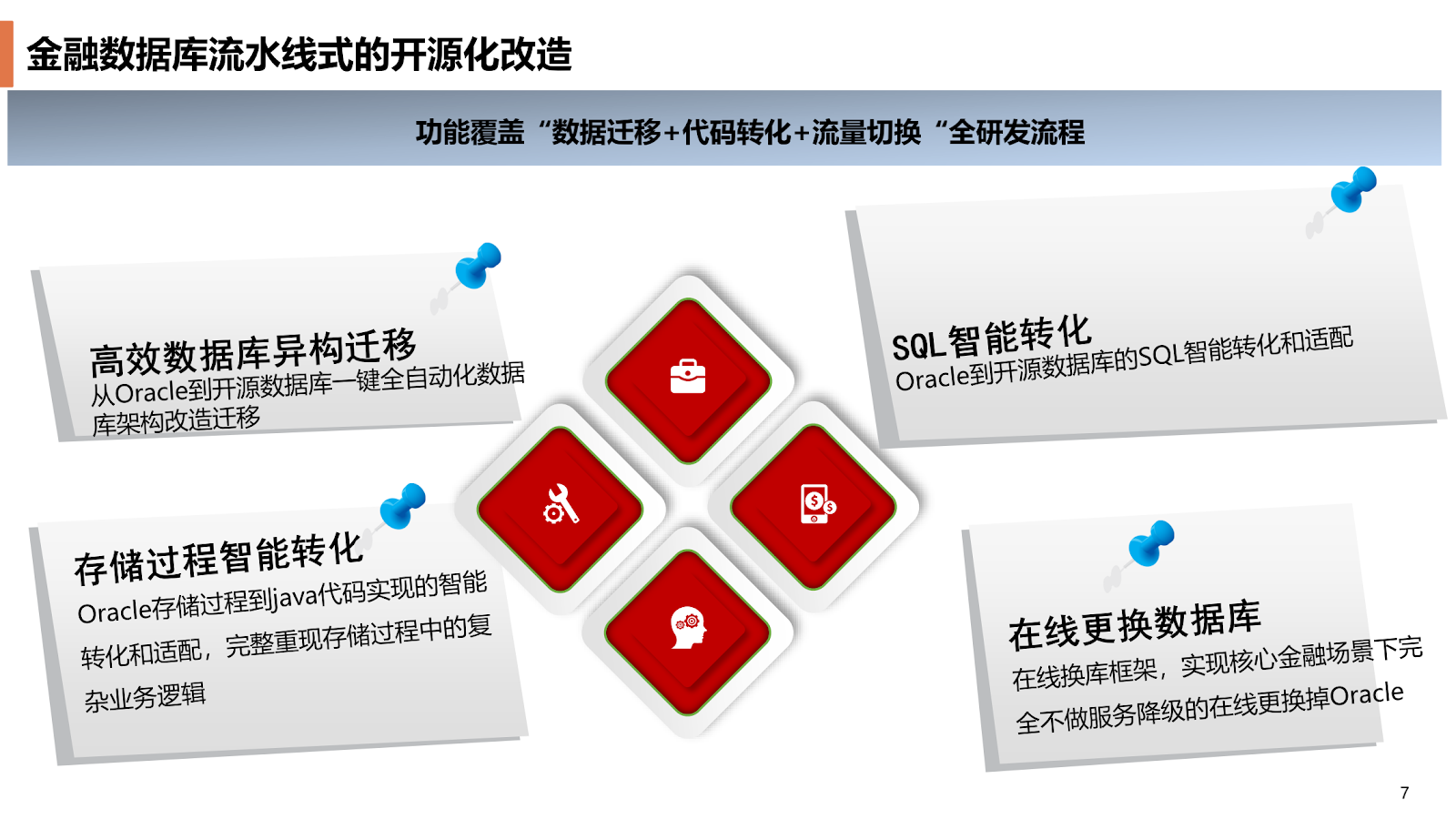 第一,高效数据库异构迁移,可以一键全自动化地把原来 Oracle 上的数据库表对象直接做完数据字典的转换,把数据迁移到新的数据库上面;