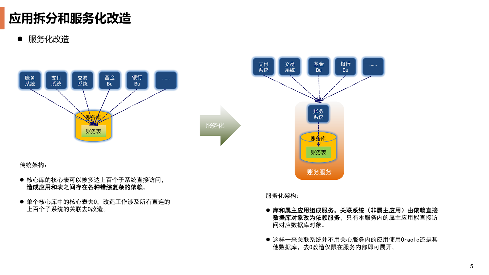 在这种架构中,去 O 工作很难有效推进,因为如果要迁移一张表,可能上层有很多关联的应用要同时进行改造,应用间的相互依赖、相互耦合会制约项目的进展。所以我们第一步是把这些数据库对象的上层应用进行服务化,规定某一个库,某一个 Schema 的某些表只能由某一个特定应用来访问,这样其他要访问这些数据的关联应用就调用他的属主应用进行数据的读写操作的访问。这样的话,我们在去 O 的改造过程中只要对这一个属主应用进行改造,其他相关联调动应用就不需要关心底层用的是什么数据库。