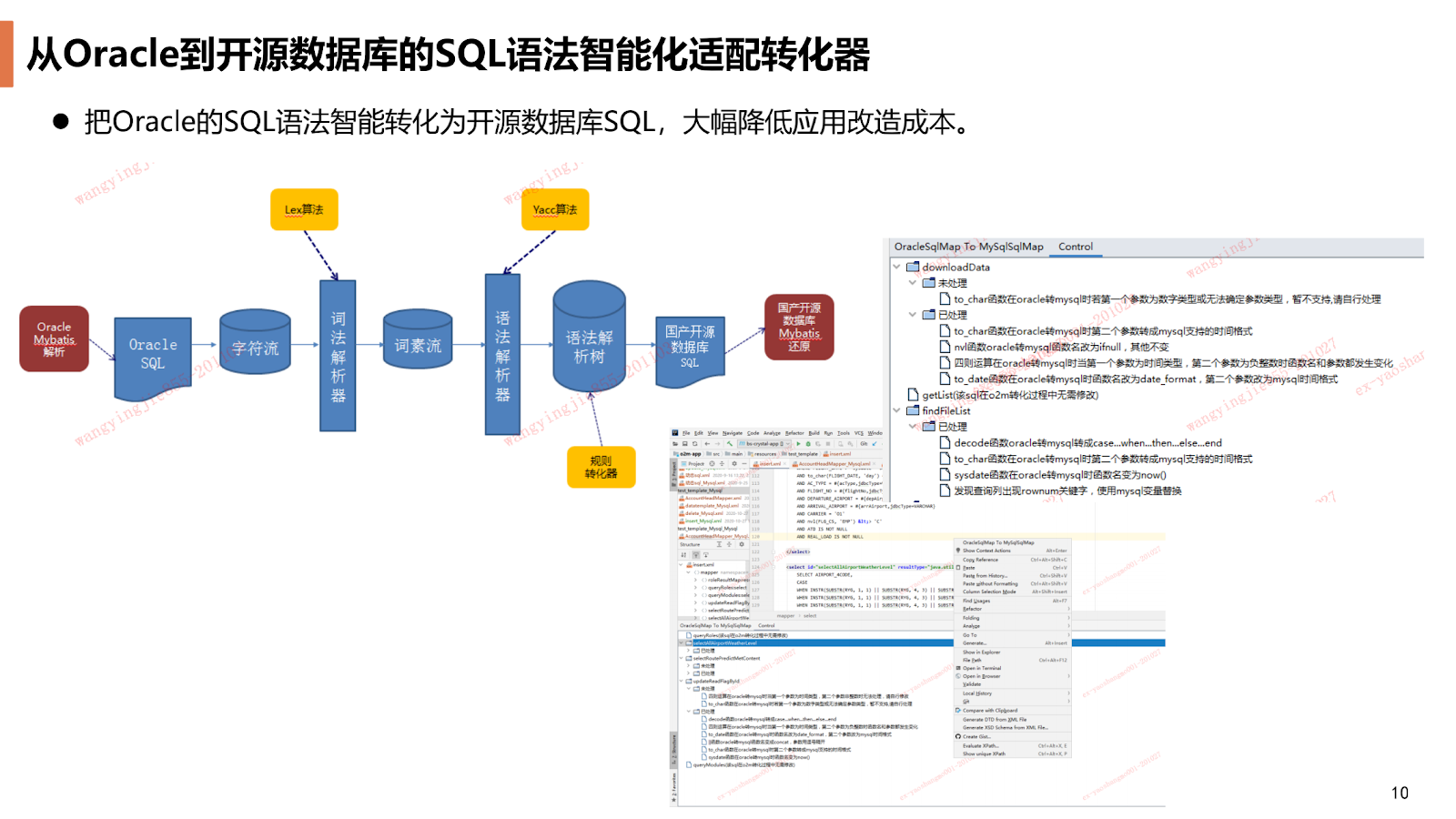 第二个工具是我们从 Oracle 到开源数据库,目前是 TiDB 和 MySQL 的 SQL 语法兼容的智能化适配转化器,现在可以基于 Java 代码的 Mybatis 的 SQLMap 文件,我们会分析它的文件的结构,根据里面 XML 的标签提取出 SQL 语句,通过 SQL 语句把它拆解成词素流 ,把每个词素进行分析,根据 Oracle 到 MySQL 特定的转换的规则去把它转换成 MySQL 的语句,然后再填充回 Mybatis 的文件。