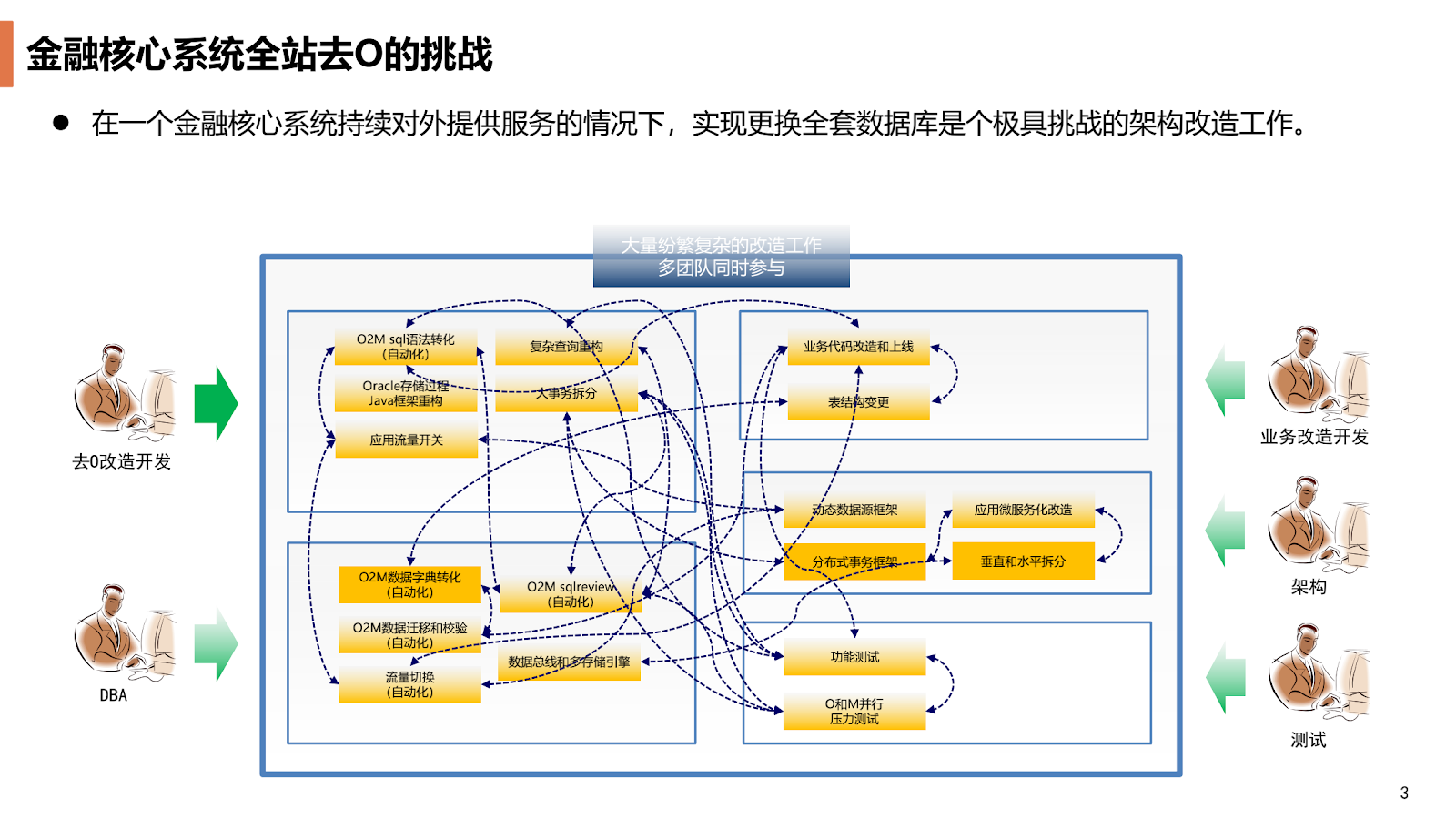 去 O 项目我们把它称之为 CTO 项目,这个项目听上去是由纯运维或 DBA 团队来主导实施的项目,但实际上替换一个异构数据库在本质上是完全不同的,它涉及到业务系统、应用系统里所有的 SQL 代码,换一个数据库就要根据新的数据库语法进行逻辑重构,所以这个项目的进展中不但有 DBA,有应用开发,还有整个架构团队。引入一个新的数据库系统会涉及到架构规范、开发规范、中间件引入等问题,需要架构团队进行支持,一些 SQL 语句跟原来的使用方法完全不一样,其上层的业务逻辑需要进行修改,包括测试、开发、产品经理、业务方,在某些情况下也需要介入。