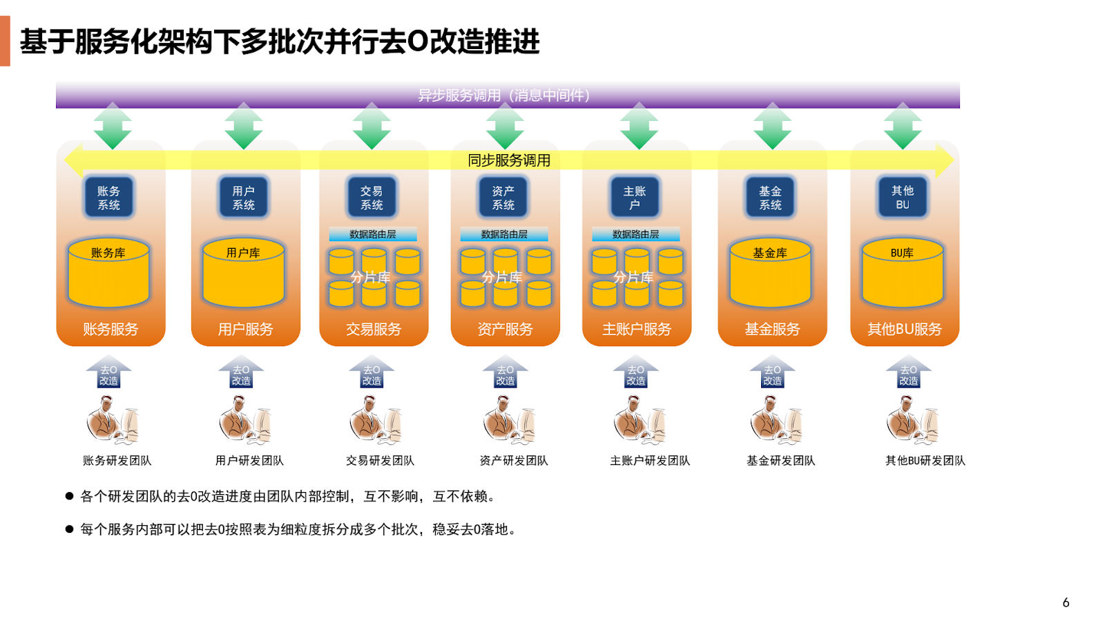 服务化改造之后,我们为了去 O 项目的快速迭代,可以在多个拆分后的业务域的属主应用下面进行去 O 改造,因为相互的耦合性已经解开了,所以整个代码改造可以并行开始。