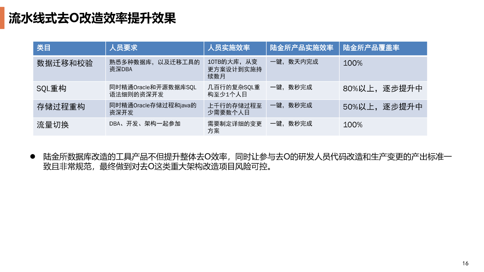 我们可以看到去 O 过程中大部分工作集中在数据库的迁移,还有开发人员的 SQL 应用改造和存储过程的重构,我们在这方面进行了相应研发,现在有两个工具可以支持我们快速转化,这也是整个去 O 过程中效率提升最大的一部分。