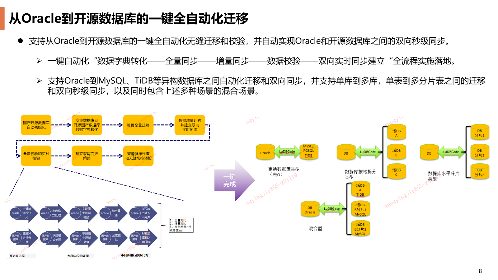 整个迁移的过程中我们也支持数据库的迁移改造。原来是一个库的,我们可以在去 O 过程中从原来的 Oracle 迁到多个 MySQL 或者多个 TiDB 库上面,也可以在一个大表的情况下拆分成支持多库的分库分表的形式,同样也是可以和上面的双向同步的架构混合使用的。