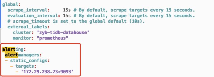 但是在启动的prometheus 的配置中并未看到alert 相关的配置,需要手动配置(下图标红的部分)。重启后又失效了