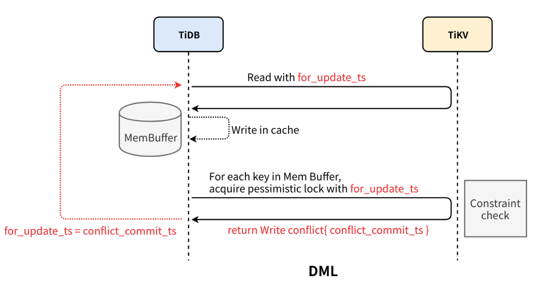 悲观事务会用 for update ts 读和检查 Write Conflict,效果等同于可更新的 start ts,当悲观事务执行 DML 发现 Write Conflict 时,就会更新 for update ts 再重试这个 DML。
