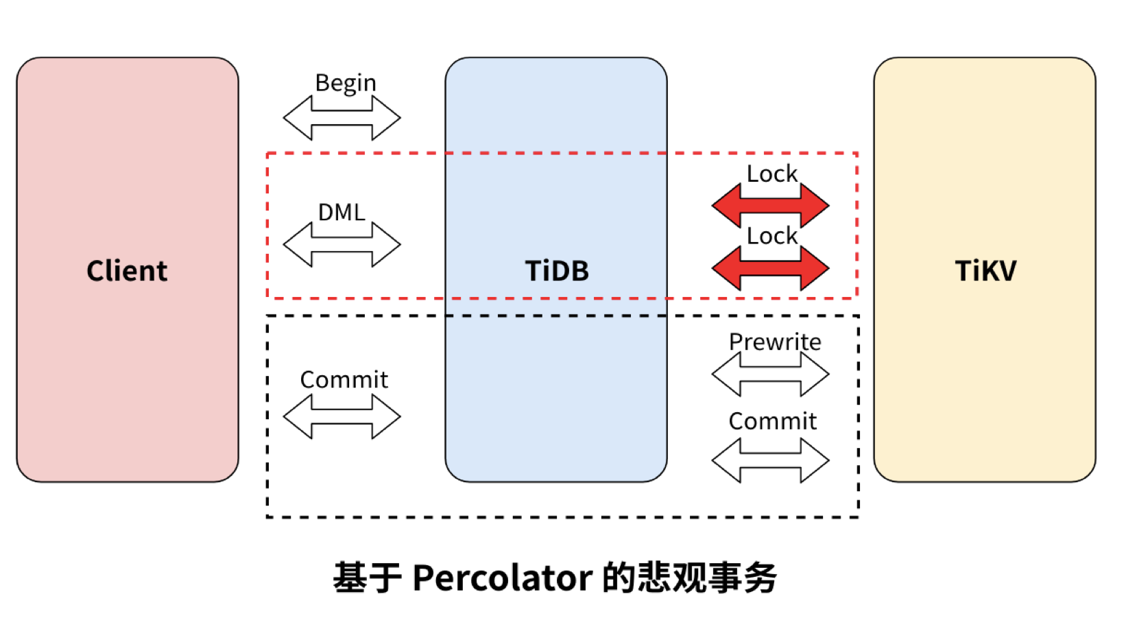 - 提交时同 Percolator,悲观锁的存在保证了 Prewrite 不会发生 Write Conflict,保证了提交一定成功。