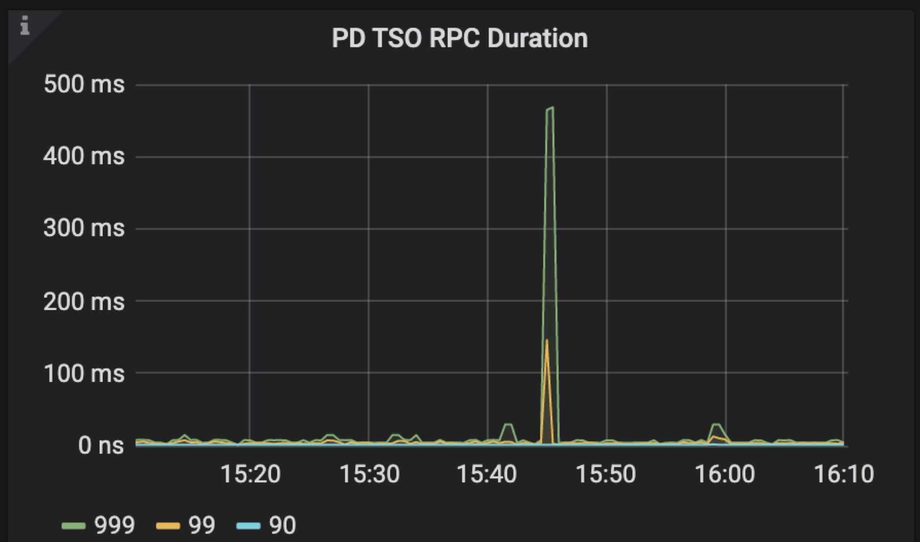 ➢ PD 负载太高,不能及时处理 TSO 的 RPC 请求,可以通过 PD Dashboard 下的 TiDB - handle requests duration 监控项确认。
