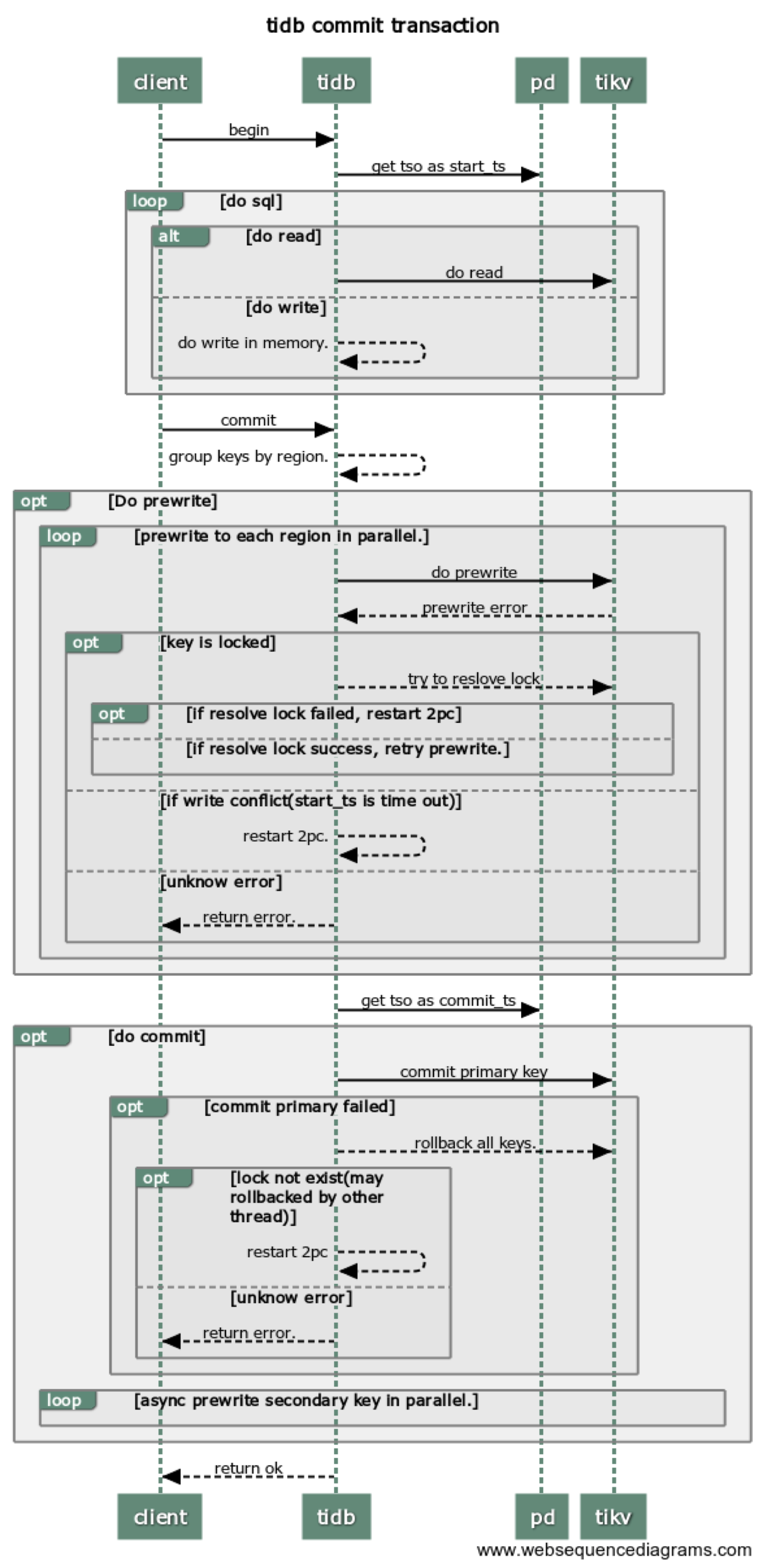 在所有的事务修改完成之后会进行事务的提交,在 TiDB 中事务提交为两阶段提交,详细介绍如下: