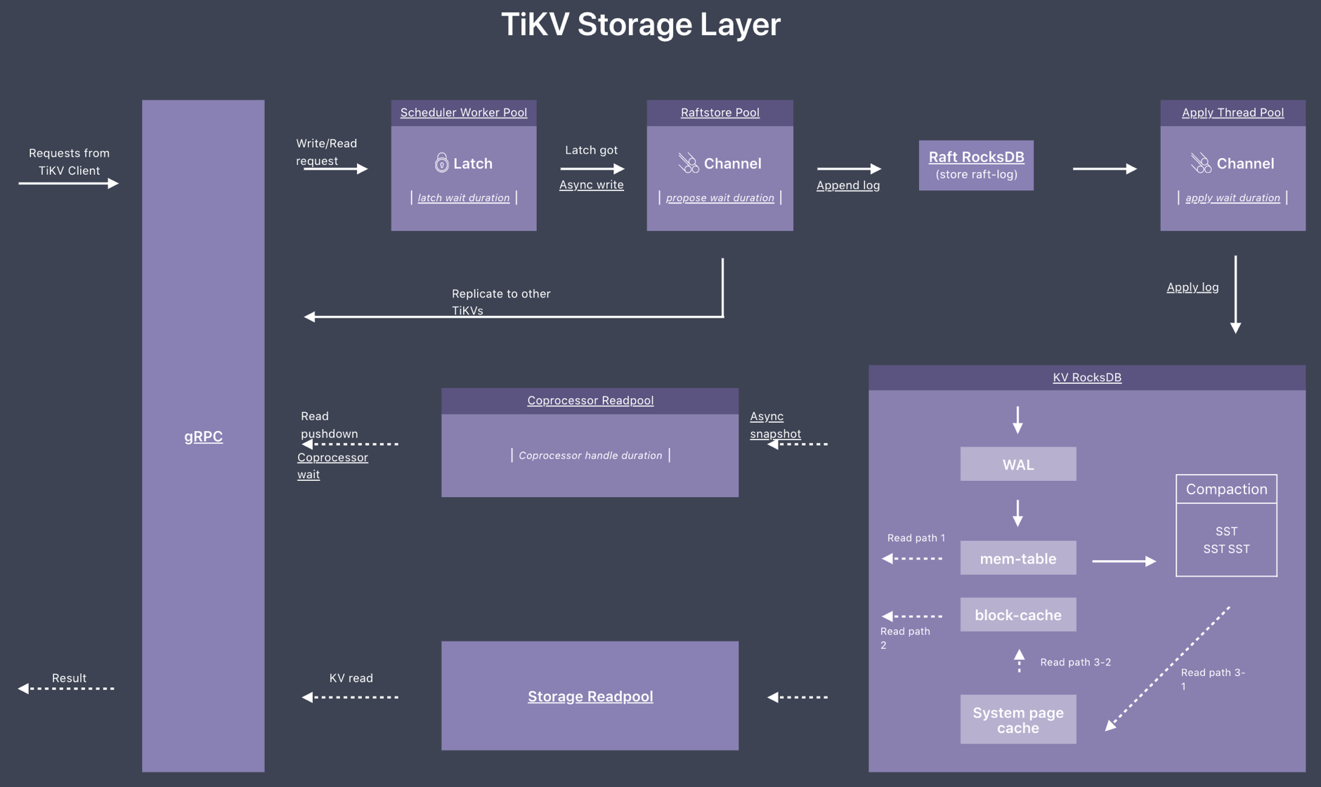 在 TiDB Server 端做完 SQL 的解析,以及冲突检测后,会将相应的请求通过 gRPC 发生给 TiKV 进一步进行事务处理两阶段提交,Raft Log 的发送以及 Apply,以及 RocksDB 的数据存储。
