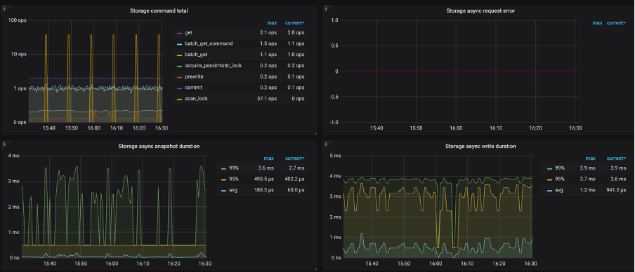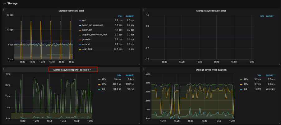 比较套路的排查思路是先看一下 CPU 是不是被打满了,如果被打满了看是不是命令的数量比较多,如果 CPU 没有打满,但是 Storage command duration 延迟比较高,就按照获取 Snapshot 和从 Snapshot 中获取 KV 比较慢进行排查(上面已讲,这里不再复述)