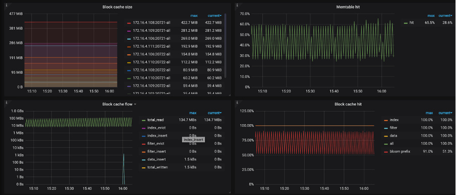 SST 文件由 Index Block(数据索引)、Filter Block(一般是 bloom filter 的数据) 和 Data Block 组成,因此在 Block Cache 相关监控中会出现 index, filter, data 相关的多个曲线。在 RocksDB 中,Block Cache 也会被分为多个 shard(由 num_shard_bits 参数控制,默认值为 6,也就是 64 个 shard,在 3.0 中已支持修改)。