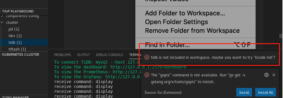 如果你不想用 workspace,或者只关心 tidb 项目,你可以尝试用 vscode 打开 tidb 这个目录,而不是 tidb-repos 这个目录试试呢。