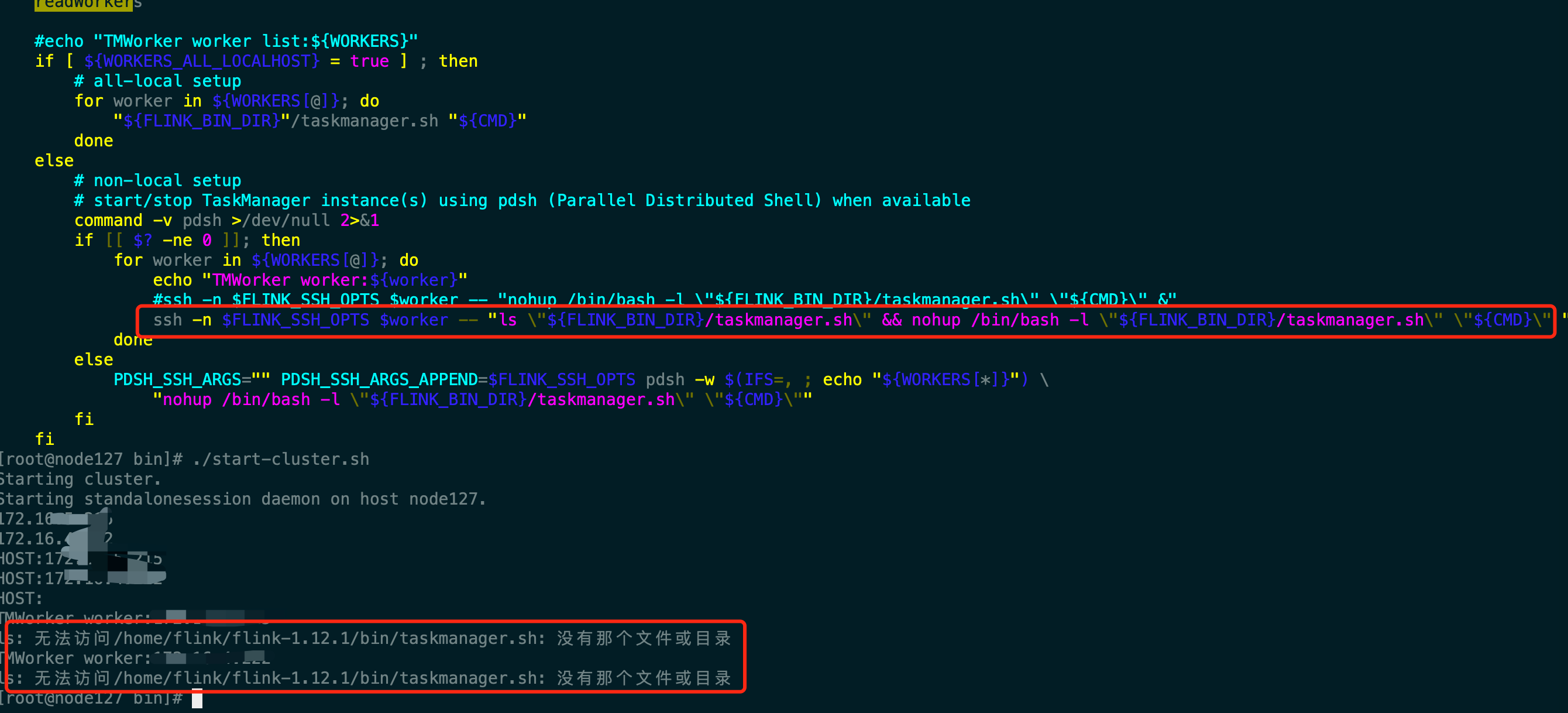 master 和 worker 节点的部署路径不同导致。因下面命令(config.sh)是 & 后台操作,因此没有错误信息输出
