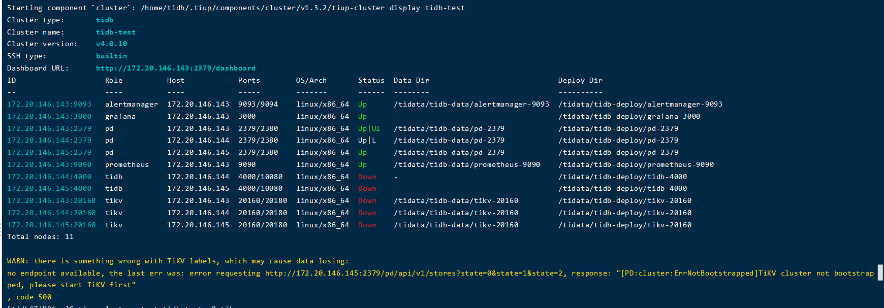 no endpoint available, the last err was: error requesting http://172.20.146.145:2379/pd/api/v1/stores?state=0&state=1&state=2 , response: “[PD:cluster:ErrNotBootstrapped]TiKV cluster not bootstrapped, please start TiKV first”