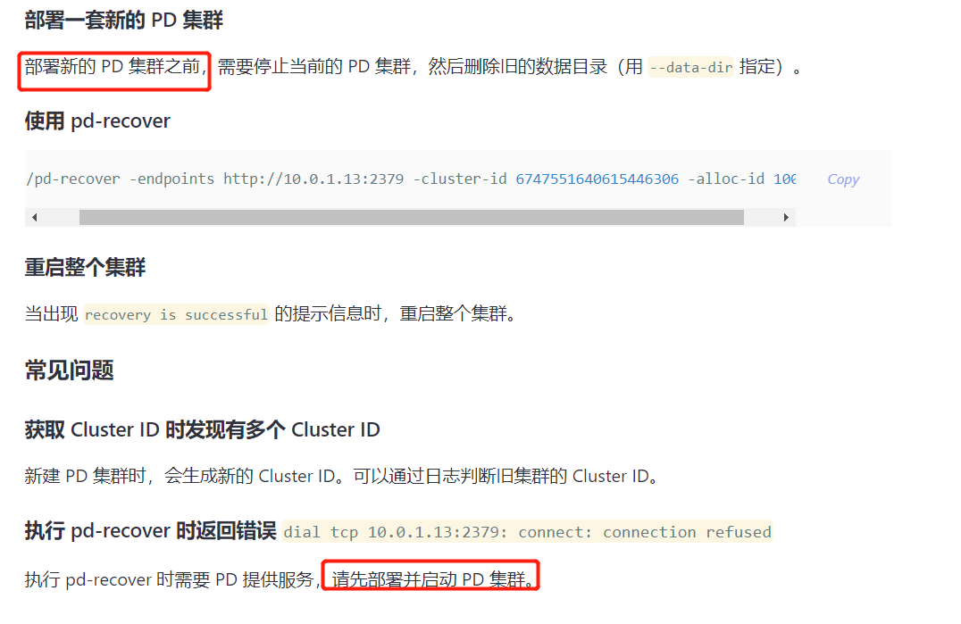 针对这个问题,我想问:官网上的步骤是:1、停掉原来的集群;2、删掉pd的data目录;3、部署新的pd集群;4、pd-recover恢复嘛?5、这个部署新的集群是怎么部署的?