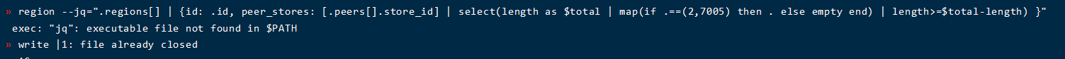 好的,谢谢,我试试,对了,问一下,我使用region --jq=".regions | {id: .id, peer_stores: [.peers.store_id] | select(length as $total | map(if .==(2,7005) then . else empty end) | length>=$total-length) }"这个的时候有问题: