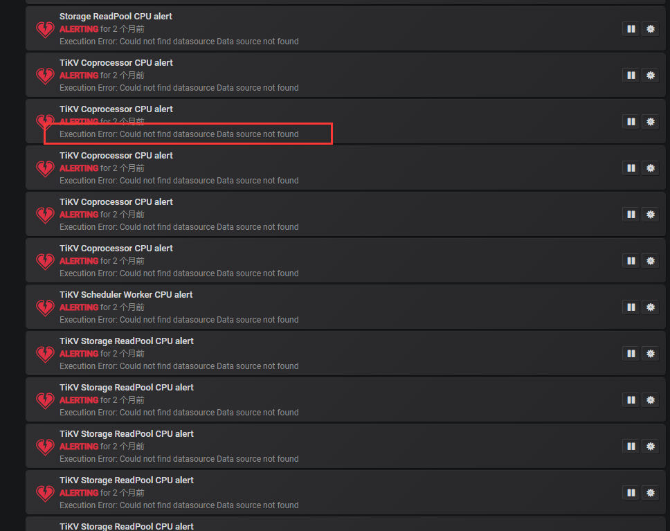 t=2022-04-28T17:32:37+0800 lvl=eror msg=“Alert Rule Result Error” logger=alerting.evalContext ruleId=52 name=“TiKV raft store CPU alert” error=“Could not find datasource Data source not found” changing state to=alerting