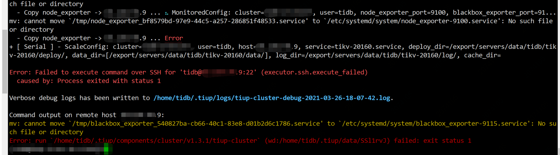 Verbose debug logs has been written to /home/tidb/.tiup/logs/tiup-cluster-debug-2021-03-26-18-07-42.log.