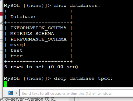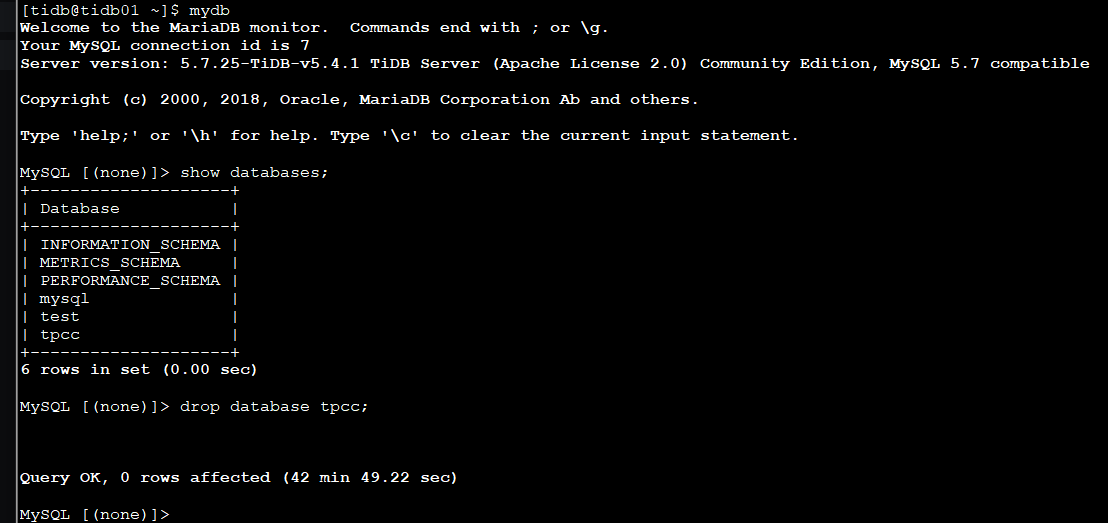 - 集群正常运行,无任何操作,drop database卡住,kill sid 无法终止,admin cancel 终止卡住,发起关闭集群的命令,drop database会在集群关闭的瞬间显示执行成功。