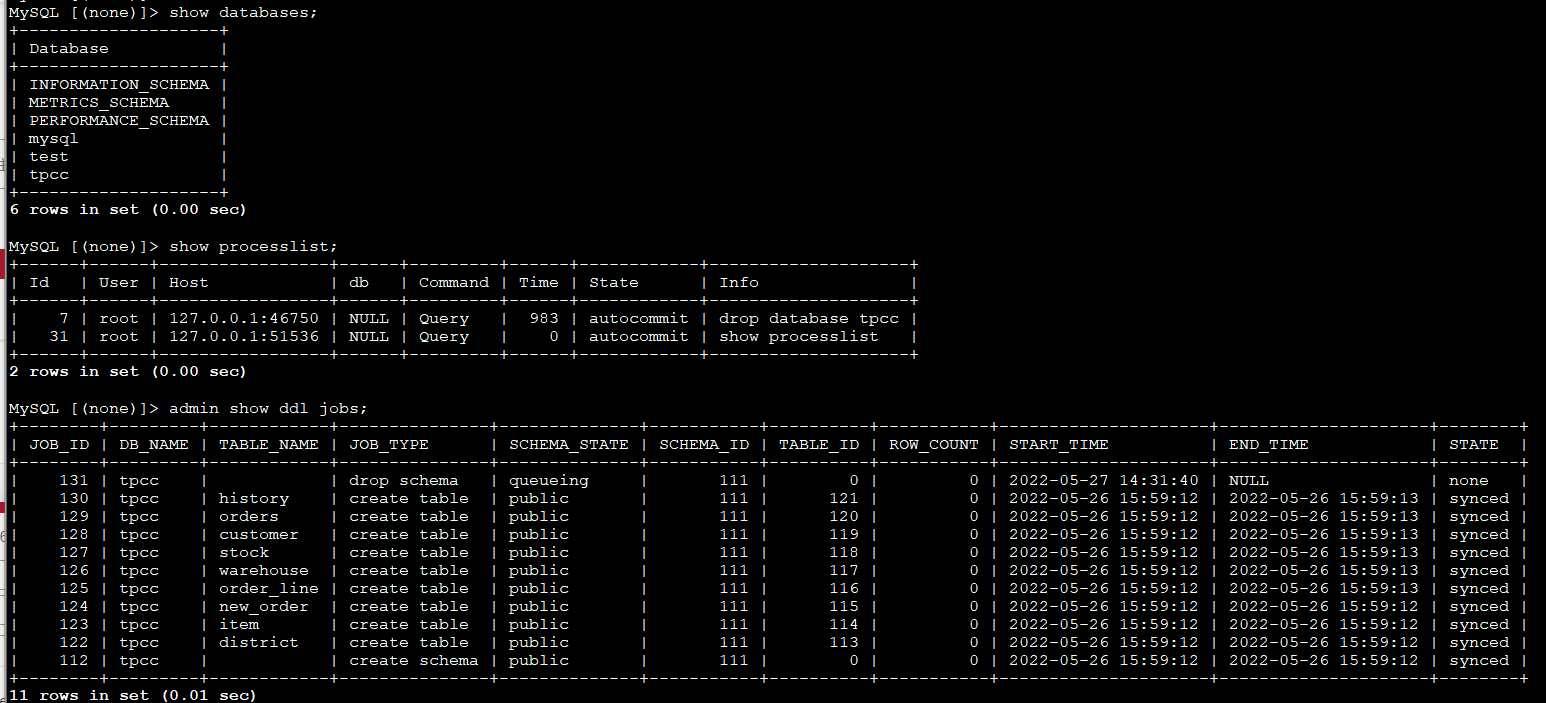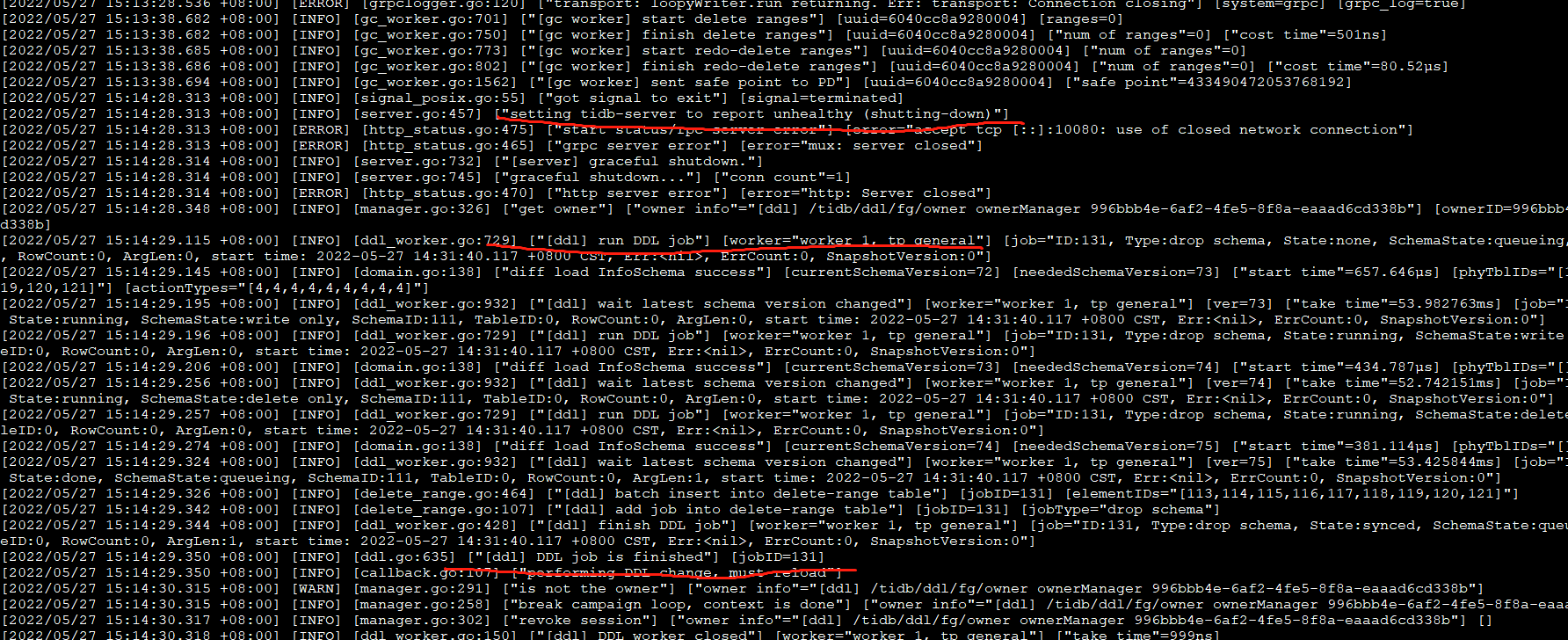 [2022/05/27 14:32:40.225 +08:00] [WARN] [expensivequery.go:179] [expensive_query] [cost_time=60.091859531s] [conn_id=7] [user=root] [txn_start_ts=0] [mem_max=“0 Bytes (0 Bytes)”] [sql=“drop database tpcc”]